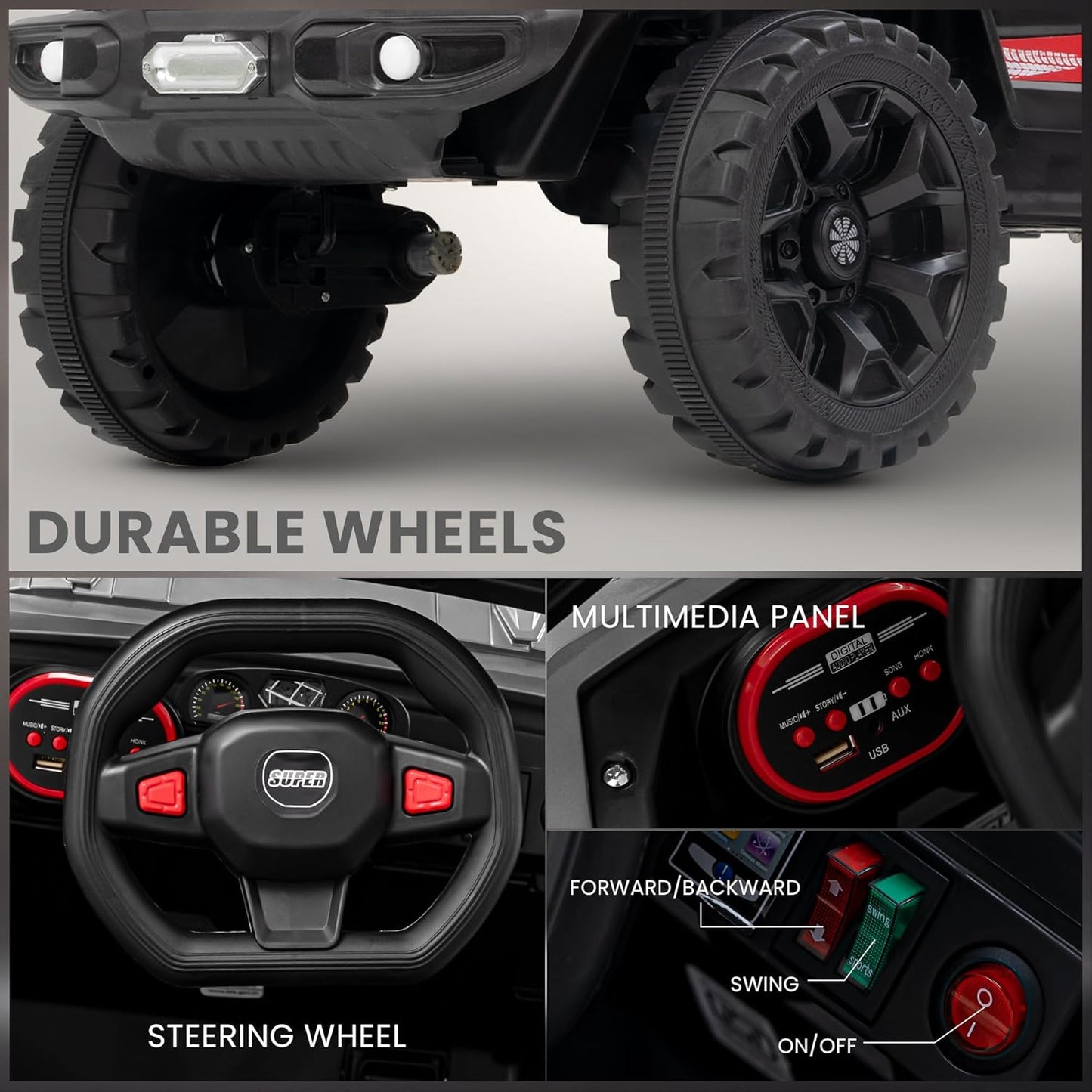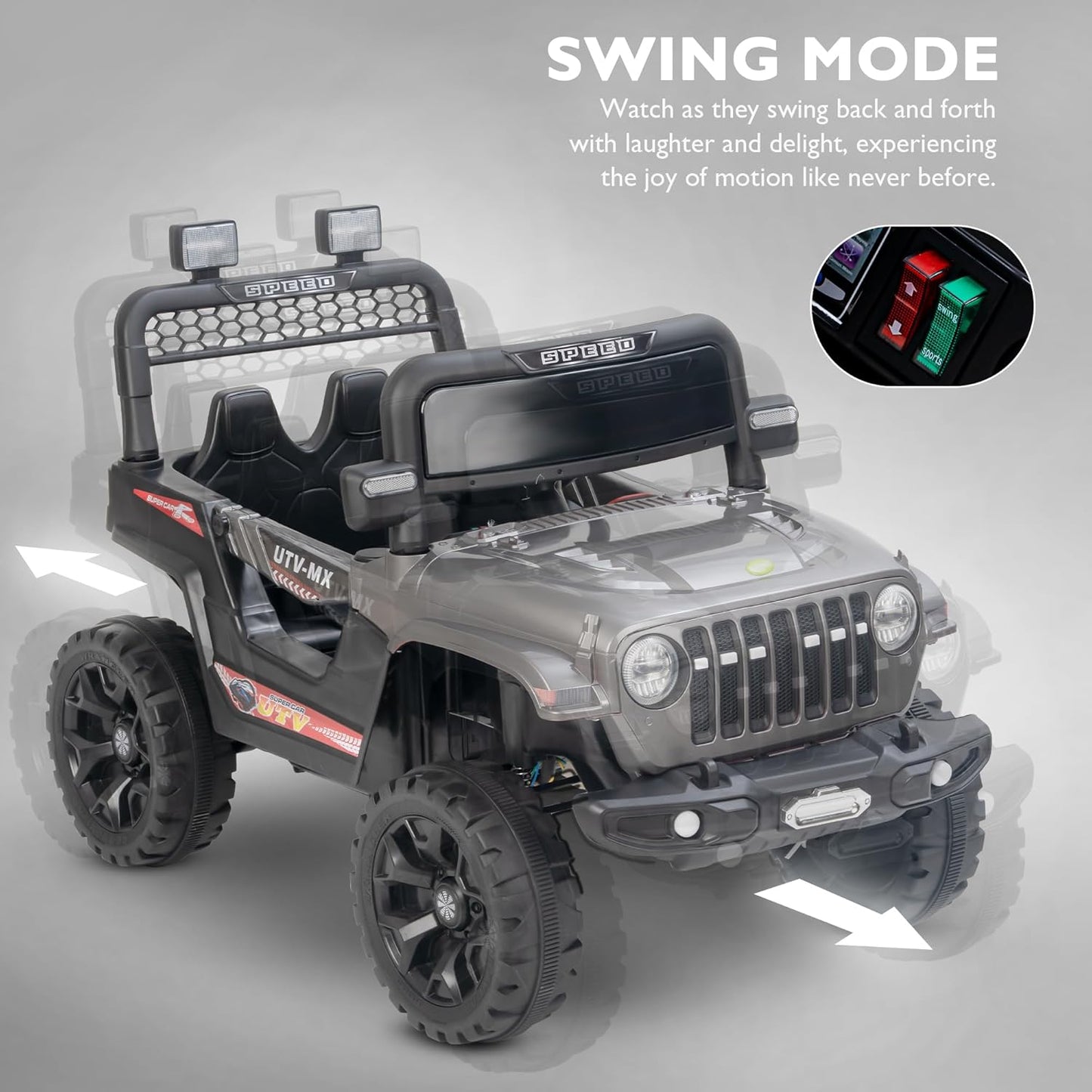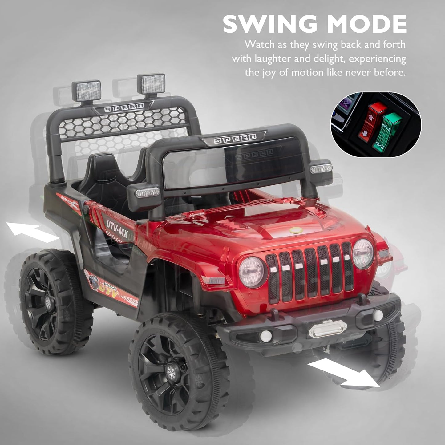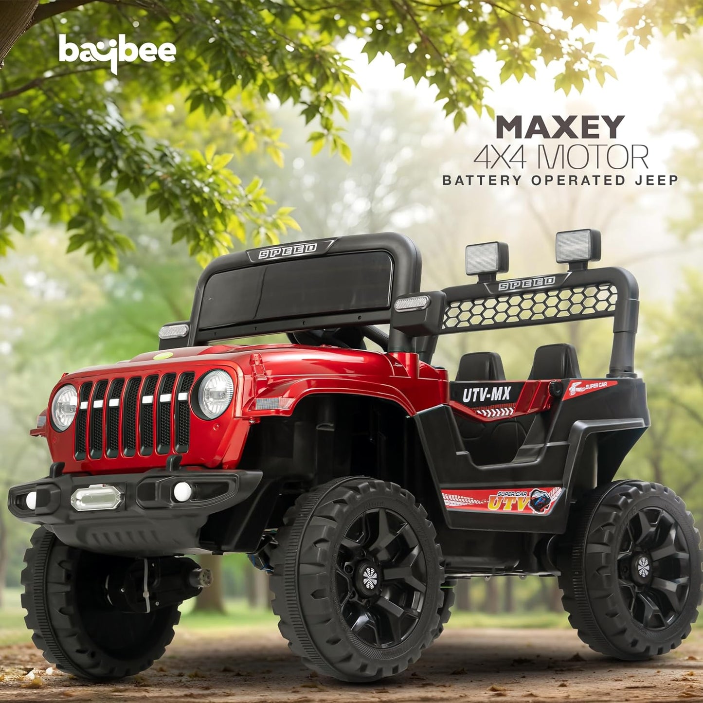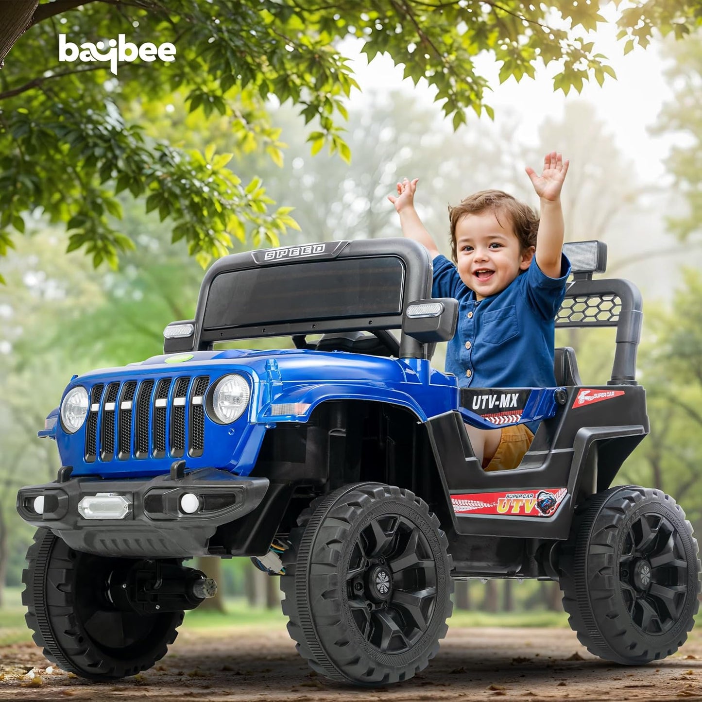 Designed to look and feel like a real off-road Jeep, this ride-on car features a robust 4×4 drive that can handle various terrains, from grass and gravel to dirt and pavement. The durable wheels and sturdy build give children an authentic, adventurous feel, making it the ultimate off-road experience tailored for young thrill-seekers. With a 2.4 GHz remote control, parents have full command of the car’s speed and direction, providing peace of mind while kids explore. This parental override feature is perfect for younger children who are still mastering their driving skills, ensuring parents can step in for safe and secure play whenever needed. This Baybee Maxey 4×4 Jeep is equipped with eye-catching LED and RGB lights that make every ride feel like a party! The front and rear lights not only look cool, but they also provide better visibility. Kids will love cruising around with the vibrant lights adding a touch of adventure to each ride, especially during evening playtime. Swing mode offers a unique experience by adding a gentle, rocking motion that feels like a mini adventure even while stationary. This soothing swing function is perfect for younger children who enjoy a soft, rocking sensation, making the car feel even more engaging and relaxing for those who need a momentary break from driving. The Jeep’s integrated music system adds a layer of fun, letting kids enjoy their favorite tunes as they drive. Equipped with preloaded tunes and MP3 compatibility, it allows little ones to groove to catchy music, enhancing their experience while promoting a sense of rhythm and joy. Parents can connect devices to play custom playlists as well! With a rechargeable battery, the Baybee Maxey Jeep promises up to 40 minutes of fun without frequent interruptions for recharging. Designed for endurance, it allows children to play continuously for an extended time, ensuring fewer breaks in the action. Simply plug it in after play, and it’s ready to go again for the next round of adventure.