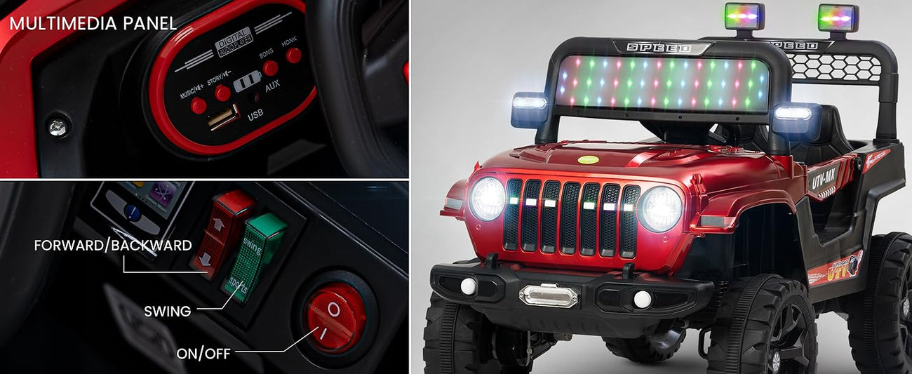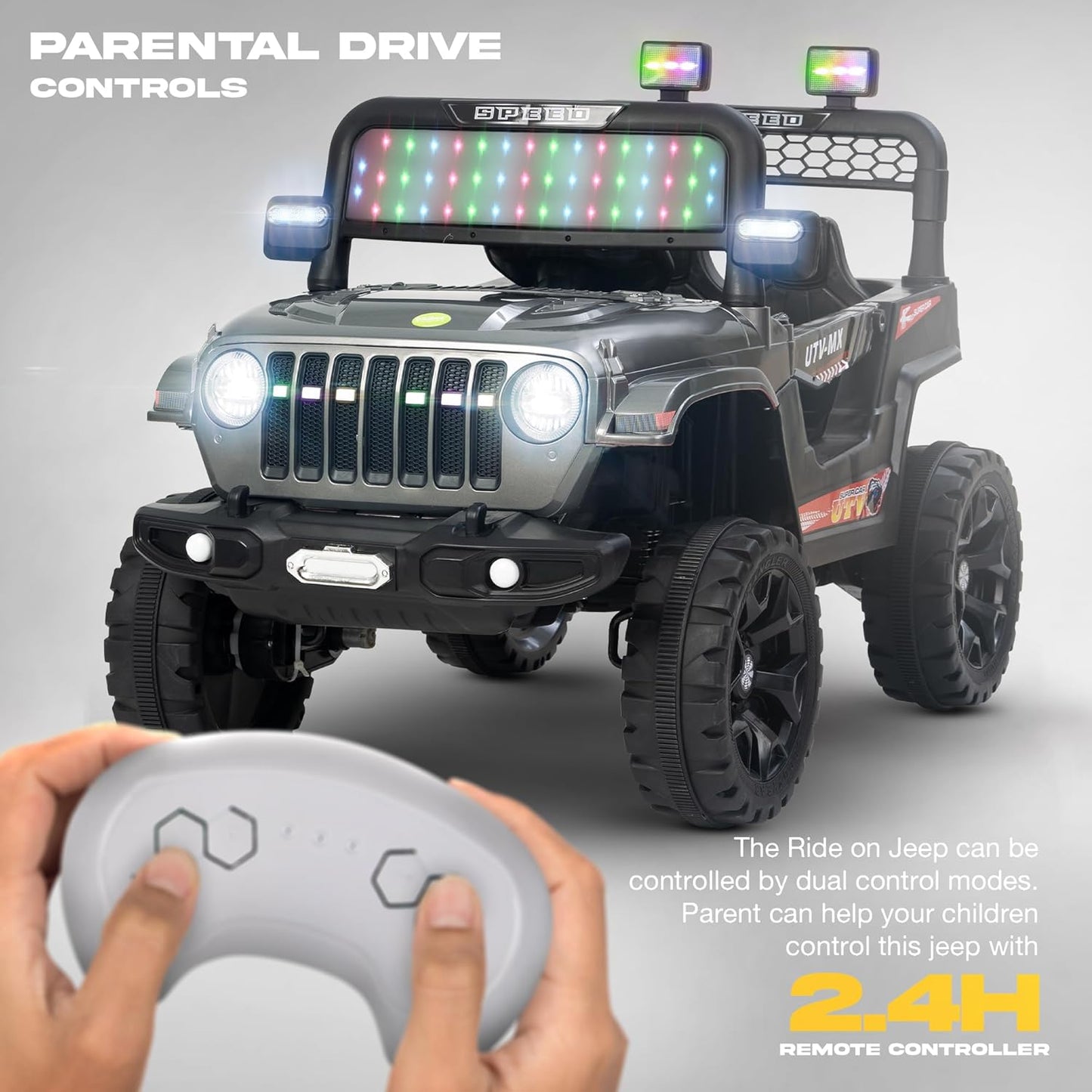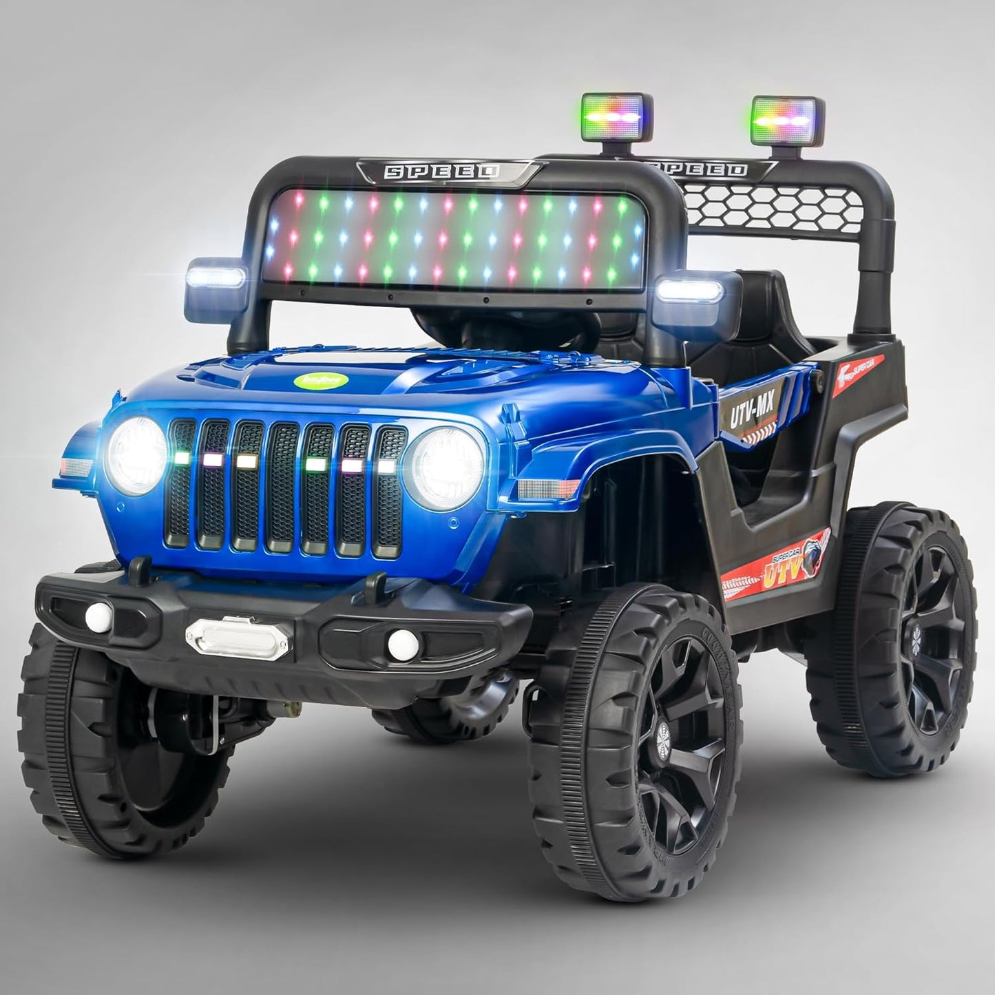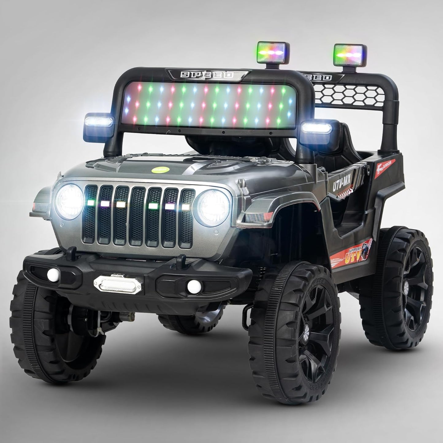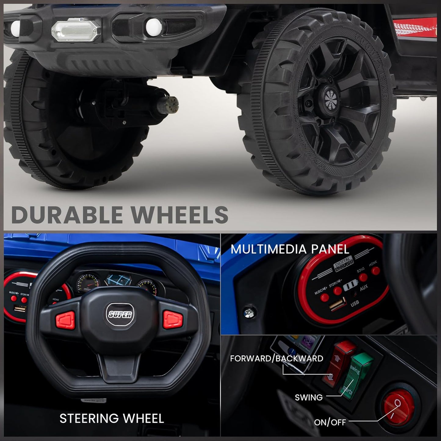 Designed to look and feel like a real off-road Jeep, this ride-on car features a robust 4×4 drive that can handle various terrains, from grass and gravel to dirt and pavement. The durable wheels and sturdy build give children an authentic, adventurous feel, making it the ultimate off-road experience tailored for young thrill-seekers. With a 2.4 GHz remote control, parents have full command of the car’s speed and direction, providing peace of mind while kids explore. This parental override feature is perfect for younger children who are still mastering their driving skills, ensuring parents can step in for safe and secure play whenever needed. This Baybee Maxey 4×4 Jeep is equipped with eye-catching LED and RGB lights that make every ride feel like a party! The front and rear lights not only look cool, but they also provide better visibility. Kids will love cruising around with the vibrant lights adding a touch of adventure to each ride, especially during evening playtime. Swing mode offers a unique experience by adding a gentle, rocking motion that feels like a mini adventure even while stationary. This soothing swing function is perfect for younger children who enjoy a soft, rocking sensation, making the car feel even more engaging and relaxing for those who need a momentary break from driving. The Jeep’s integrated music system adds a layer of fun, letting kids enjoy their favorite tunes as they drive. Equipped with preloaded tunes and MP3 compatibility, it allows little ones to groove to catchy music, enhancing their experience while promoting a sense of rhythm and joy. Parents can connect devices to play custom playlists as well! With a rechargeable battery, the Baybee Maxey Jeep promises up to 40 minutes of fun without frequent interruptions for recharging. Designed for endurance, it allows children to play continuously for an extended time, ensuring fewer breaks in the action. Simply plug it in after play, and it’s ready to go again for the next round of adventure.