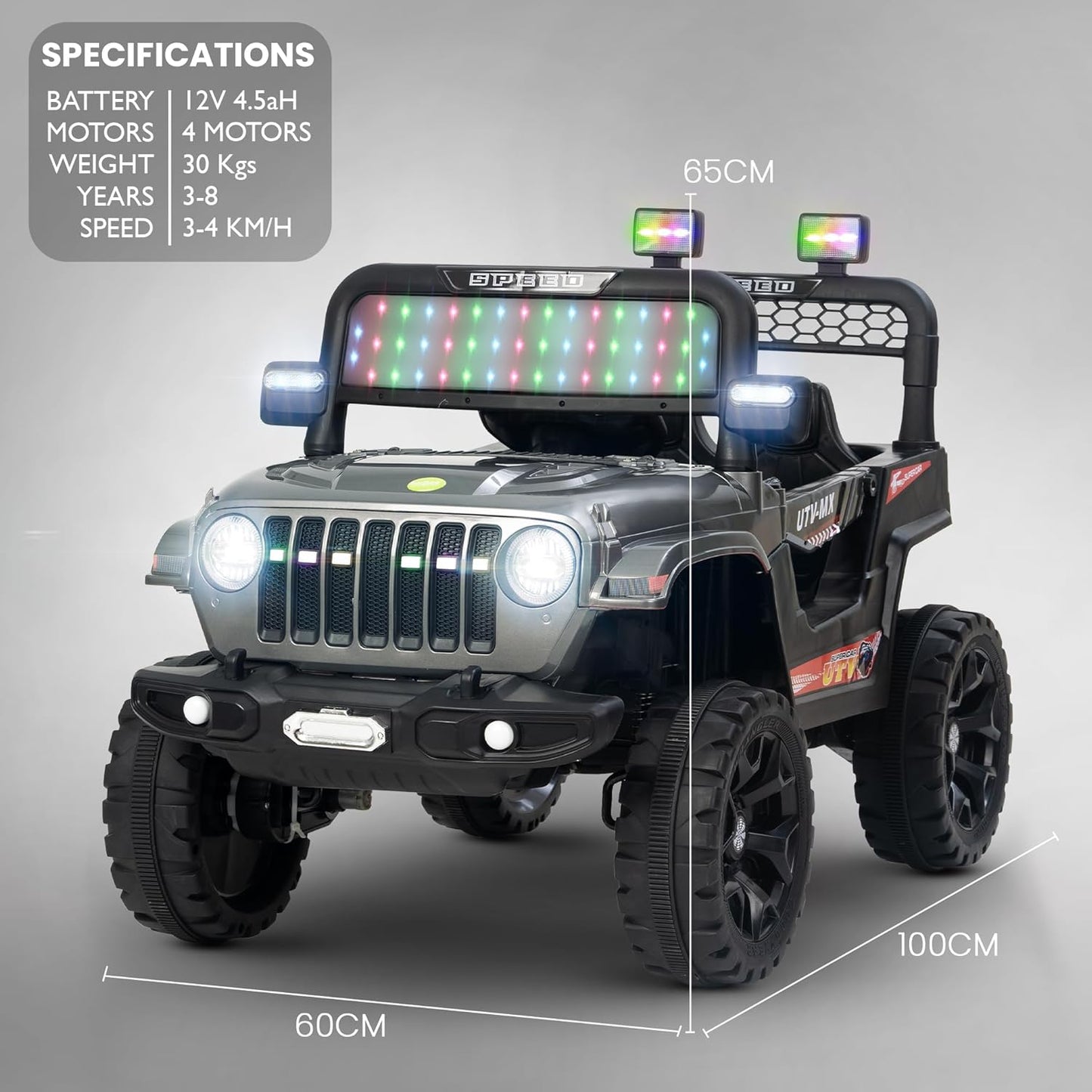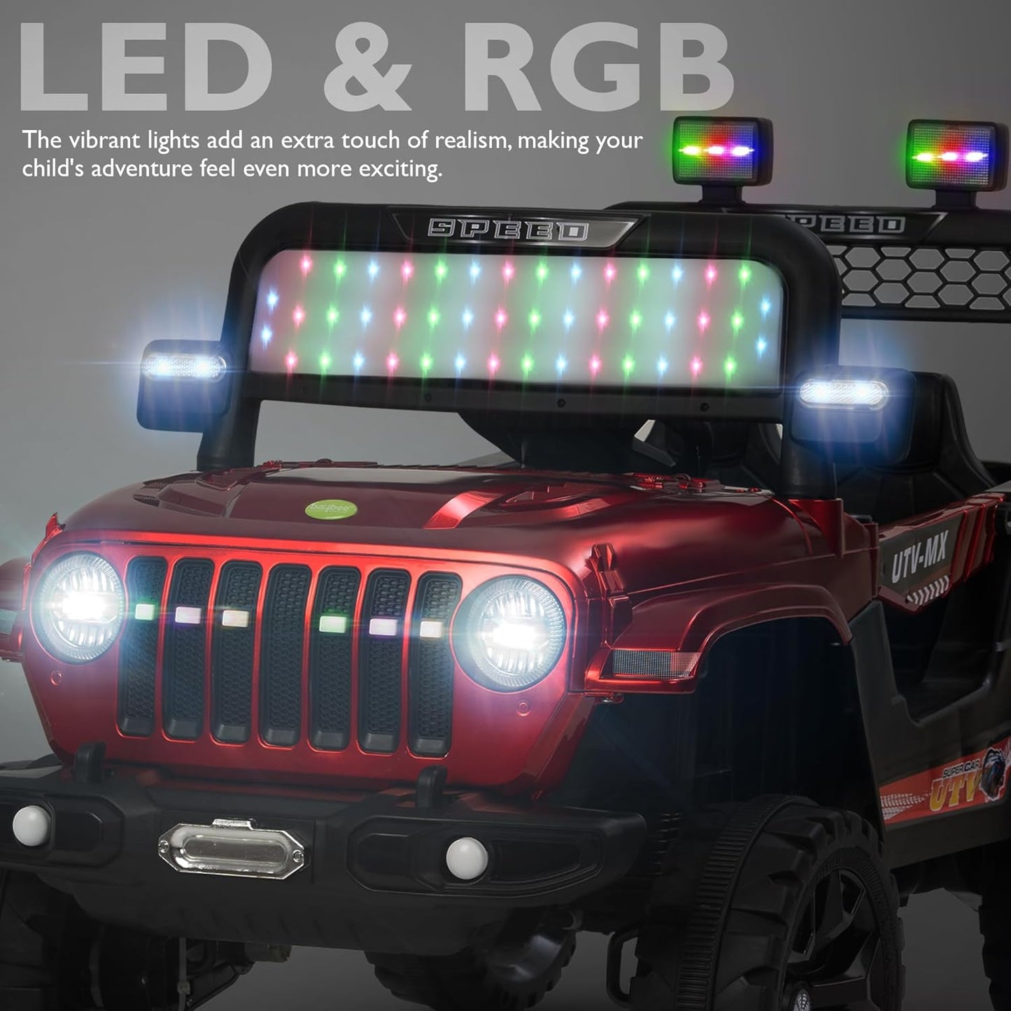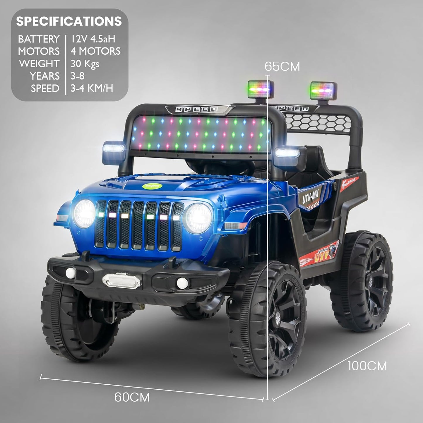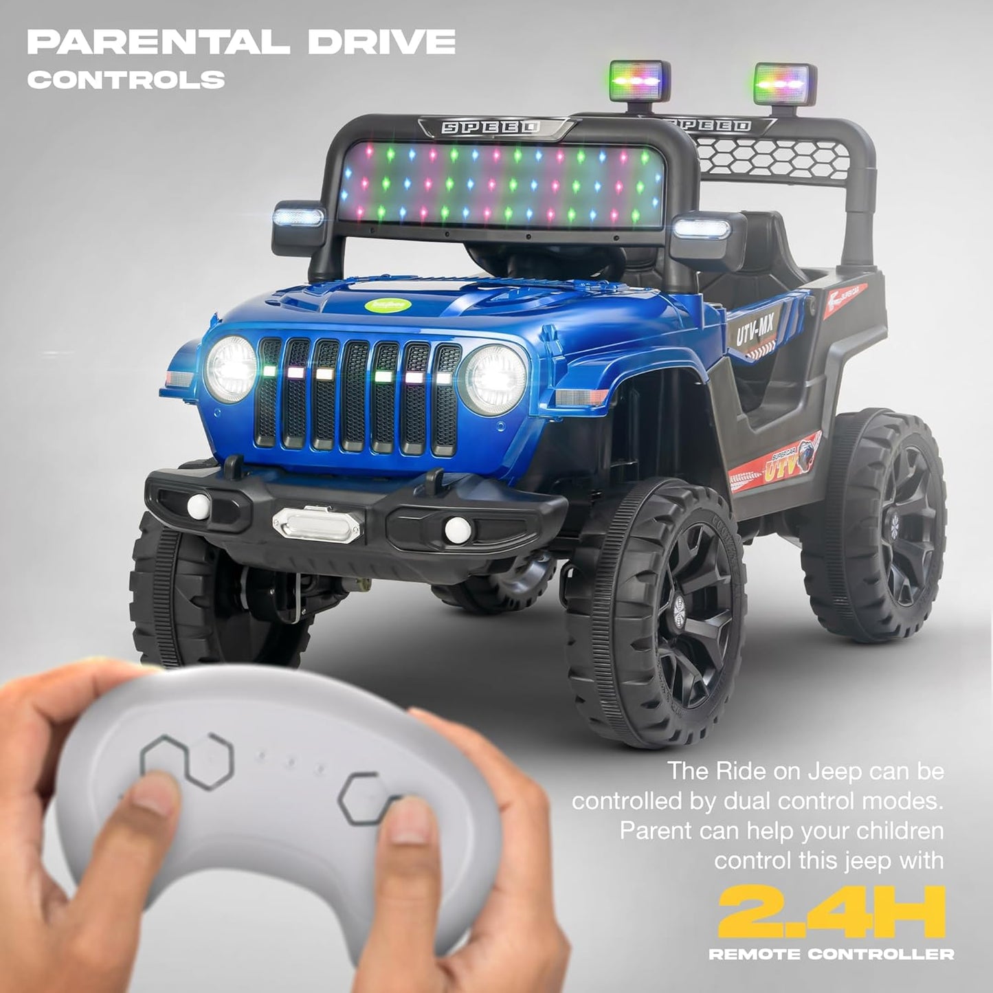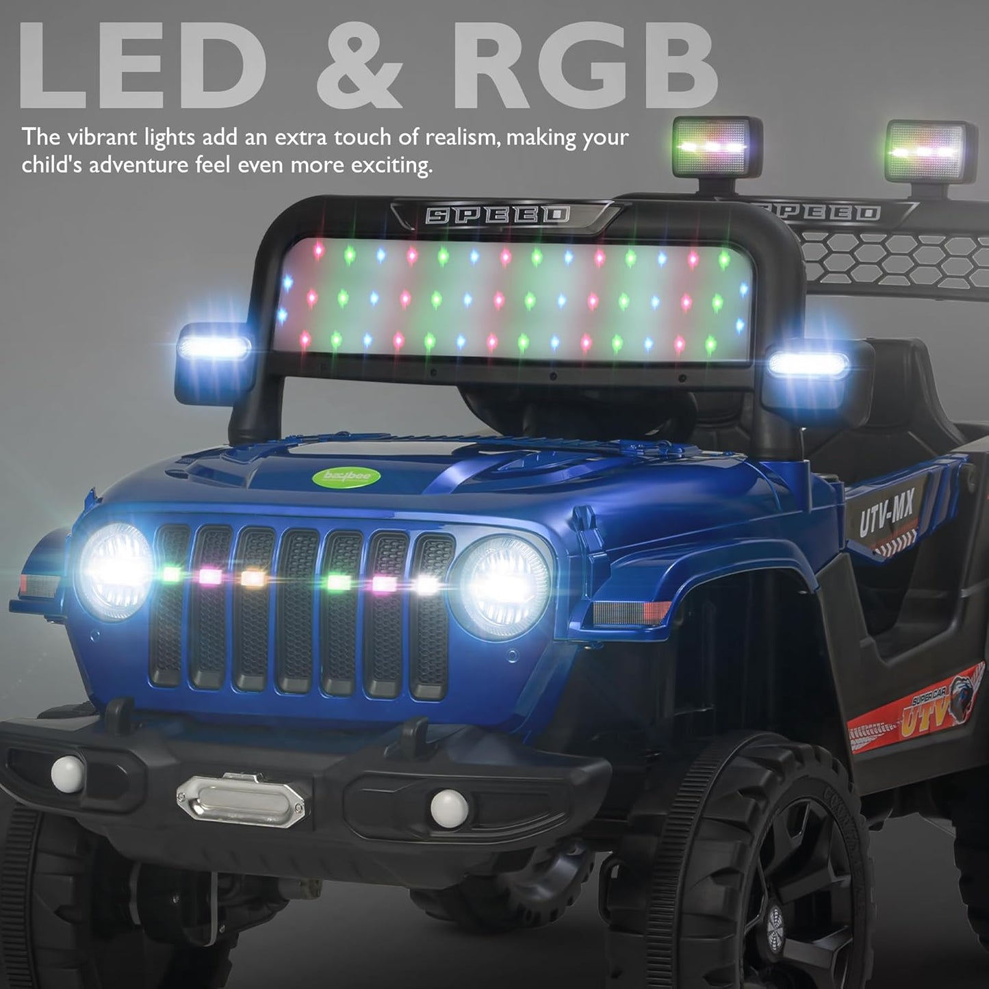 Designed to look and feel like a real off-road Jeep, this ride-on car features a robust 4×4 drive that can handle various terrains, from grass and gravel to dirt and pavement. The durable wheels and sturdy build give children an authentic, adventurous feel, making it the ultimate off-road experience tailored for young thrill-seekers. With a 2.4 GHz remote control, parents have full command of the car’s speed and direction, providing peace of mind while kids explore. This parental override feature is perfect for younger children who are still mastering their driving skills, ensuring parents can step in for safe and secure play whenever needed. This Baybee Maxey 4×4 Jeep is equipped with eye-catching LED and RGB lights that make every ride feel like a party! The front and rear lights not only look cool, but they also provide better visibility. Kids will love cruising around with the vibrant lights adding a touch of adventure to each ride, especially during evening playtime. Swing mode offers a unique experience by adding a gentle, rocking motion that feels like a mini adventure even while stationary. This soothing swing function is perfect for younger children who enjoy a soft, rocking sensation, making the car feel even more engaging and relaxing for those who need a momentary break from driving. The Jeep’s integrated music system adds a layer of fun, letting kids enjoy their favorite tunes as they drive. Equipped with preloaded tunes and MP3 compatibility, it allows little ones to groove to catchy music, enhancing their experience while promoting a sense of rhythm and joy. Parents can connect devices to play custom playlists as well! With a rechargeable battery, the Baybee Maxey Jeep promises up to 40 minutes of fun without frequent interruptions for recharging. Designed for endurance, it allows children to play continuously for an extended time, ensuring fewer breaks in the action. Simply plug it in after play, and it’s ready to go again for the next round of adventure.